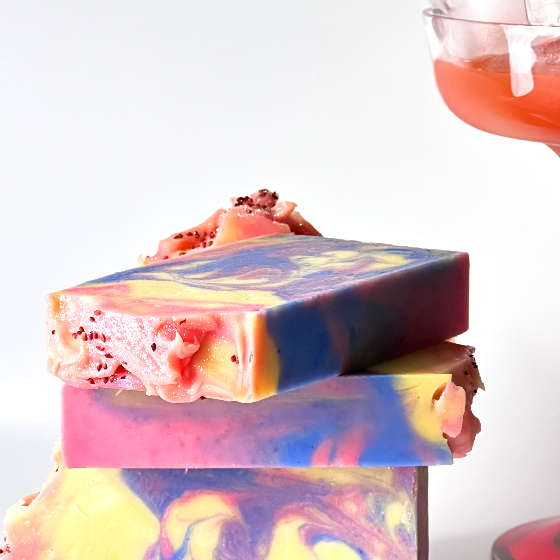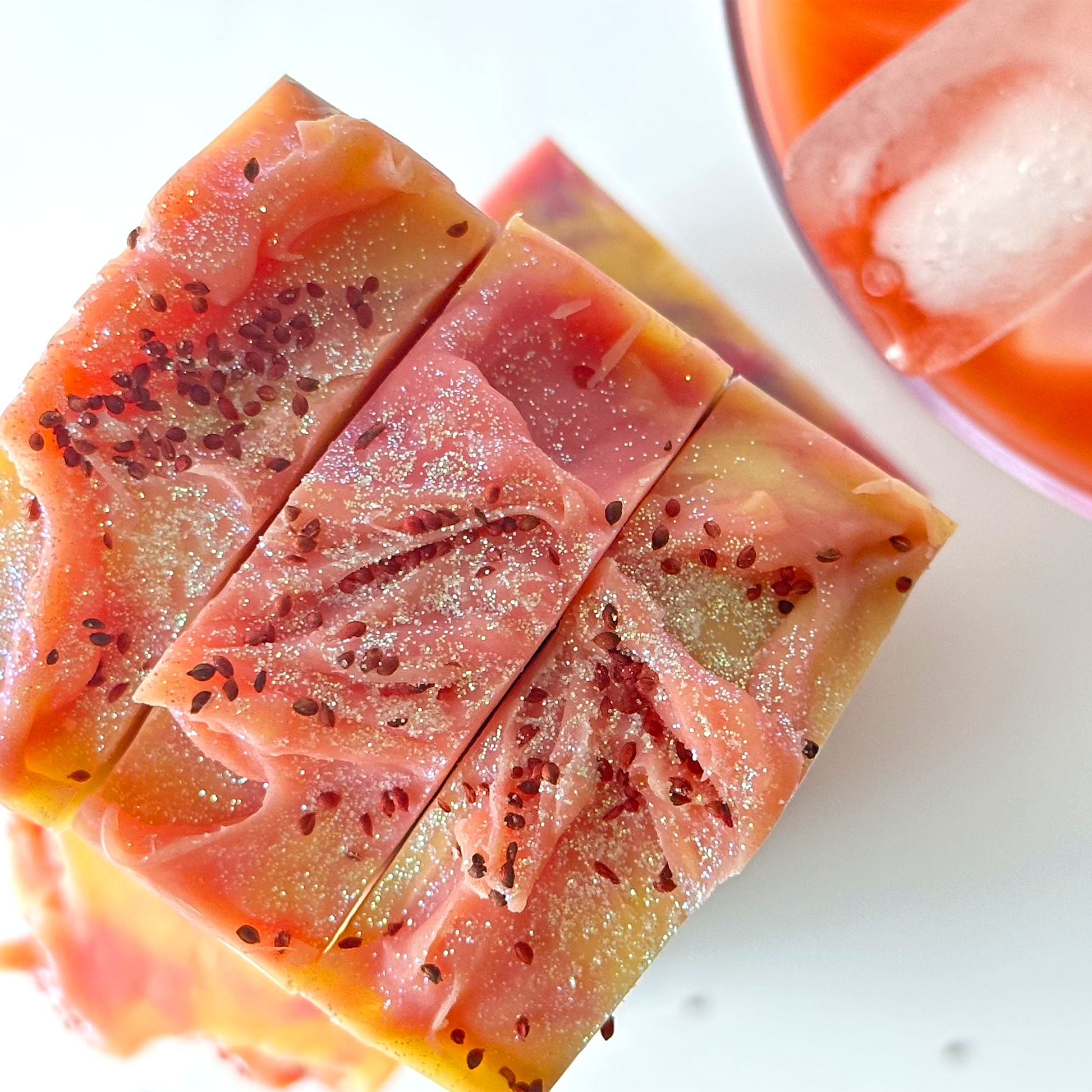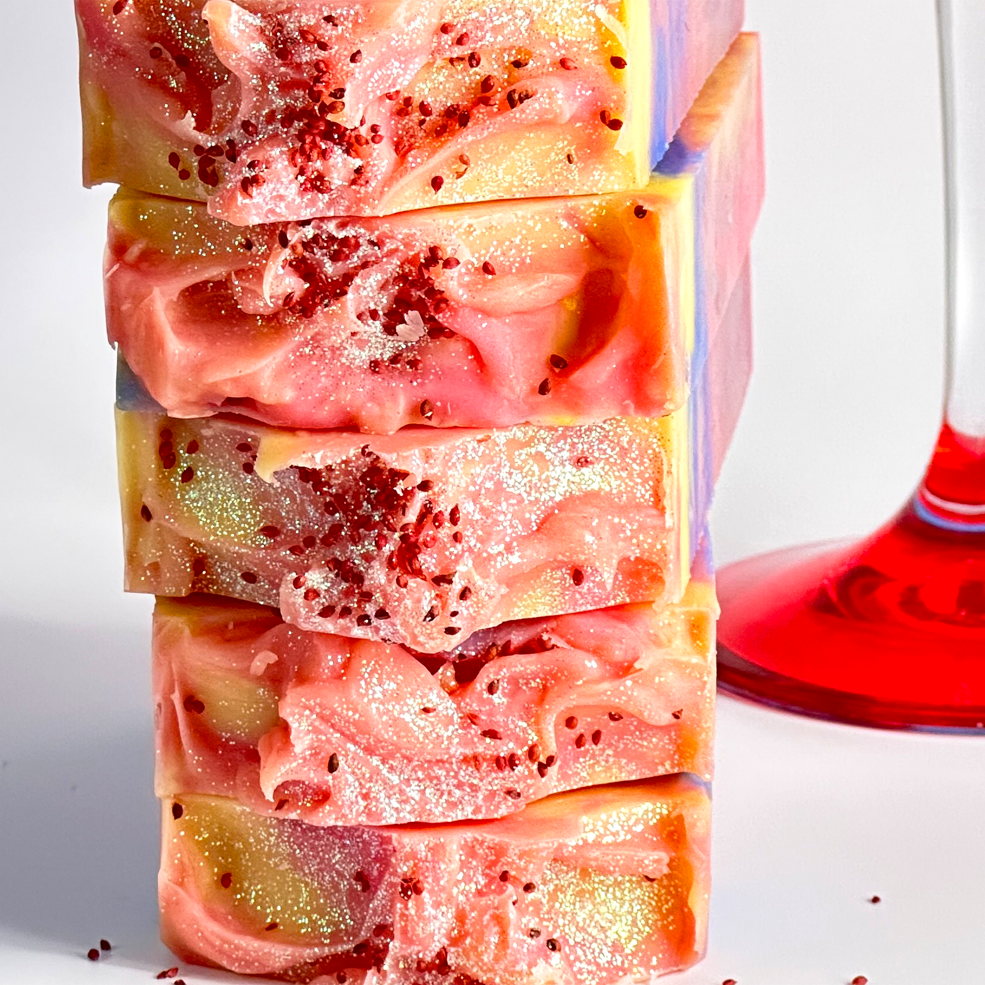 Cocos Nucifera (Coconut) Oil, Olea Europaea (Olive) Oil, Aqua, Sodium Hydroxide, Oryza Sativa (Ricebran) Oil, Shea Butter, Persea Gratissima (Avocado Oil), Parfum (Fragrance) Oil, Kaolin, Vaccinium Macrocarpon (Cranberry) Seeds, Titanium Dioxide, Iron Oxide, Mica, Eco-Friendly Glitter